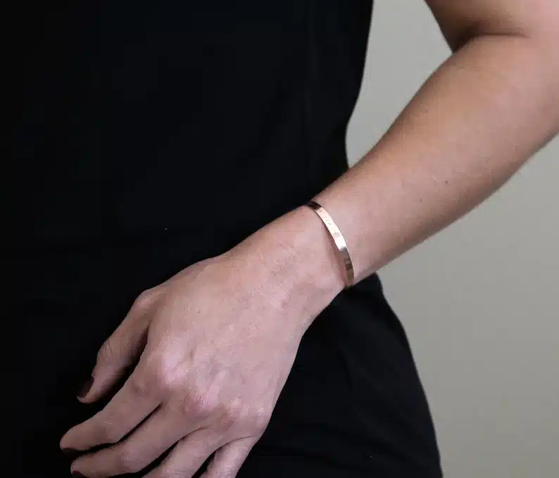 The cuff is about 6″ long and can be gently bent to slide around and fit your writs.